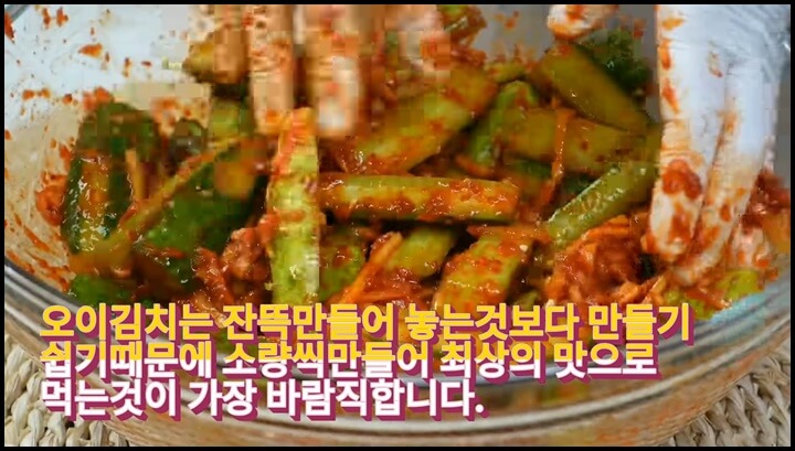 [출처 : 유튜브 양장금주부, 오이김치 맛있게 담그는법, 무르지 않게 담그는방법]