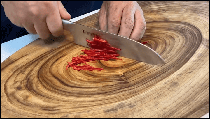 4) 홍고추 1개는 고명을 사용할거니 반으로 갈라 씨를 제거한 다음 가늘게 채 썰어줍니다.