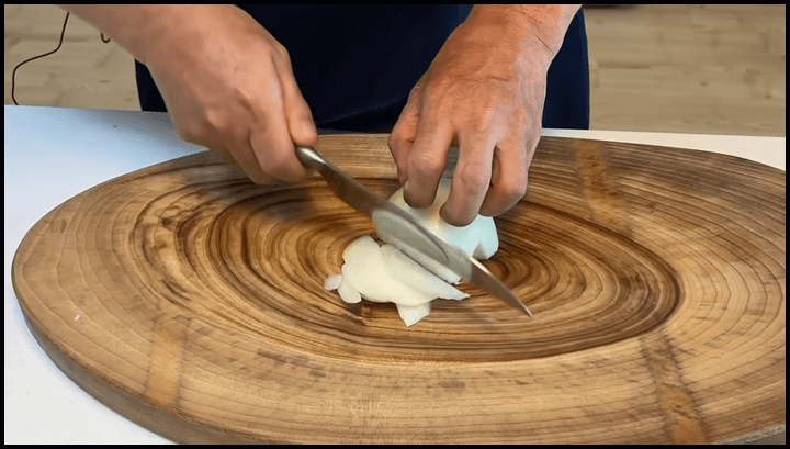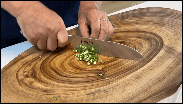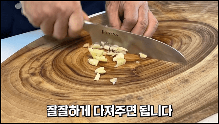 5) 마늘 2개는 칼로 다져줍니다. 이렇게 다져서 사용하면 간 마늘보다 식감도 있고 마늘향도 살아있습니다.