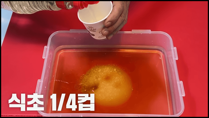 4) 식초는 종이컵 1/4컵을 넣습니다. 식초가 어느정도 들어가야 맛이 나는데 식초 양은 취향껏 조절하면 됩니다.