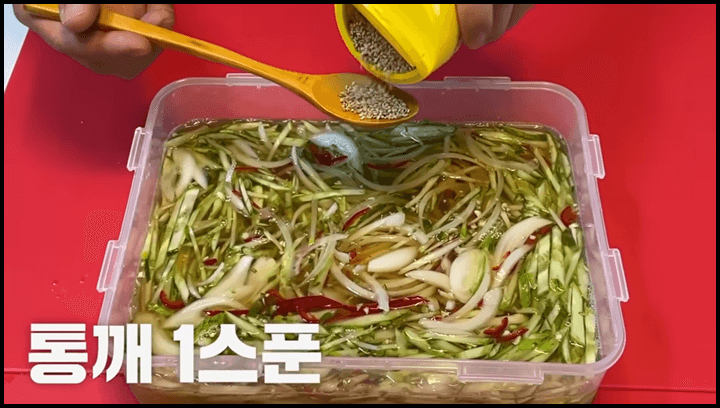 3) 통깨 1스푼을 넣어줍니다. 그러면 오이냉국 완성입니다.