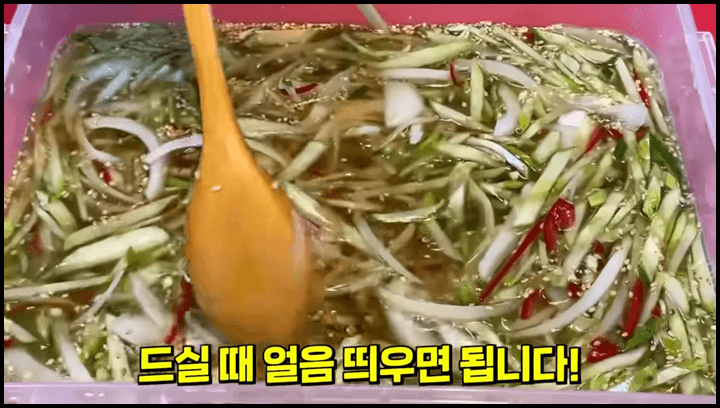 4) 얼음은 지금 넣는 것이 아니라 먹을 때 그릇에 얼음을 넣은 후 오이냉국을 덜어서 담으면 됩니다.