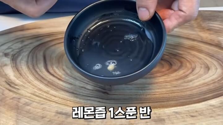 소금과 설탕이 모두 다 녹을 때까지 잘 저어줍니다. 소금과 설탕이 어느 정도 다 녹았으면 레몬즙 1스푼 반을 넣어줍니다.