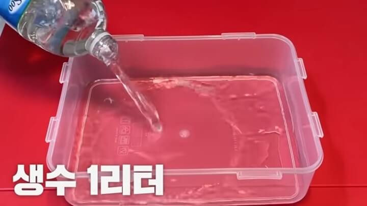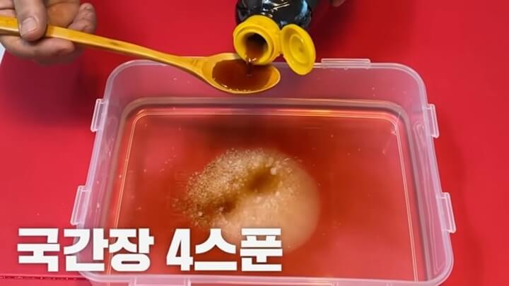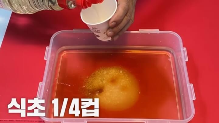 그릇에 생수 1리터를 부어줍니다. 그리고 설탕 2스푼, 소금 1스푼, 멸치액젓 2스푼, 매실액 2스푼, 국간장 4스푼을 넣고, 식초는 종이컵으로 1/4컵을 넣어줍니다. 식초가 어느 정도 들어가야 맛이 나고, 적게 들어가면 밋밋해서 맛이 나지 않으니 참고하셔서 취향껏 식초 양을 조절하세요.