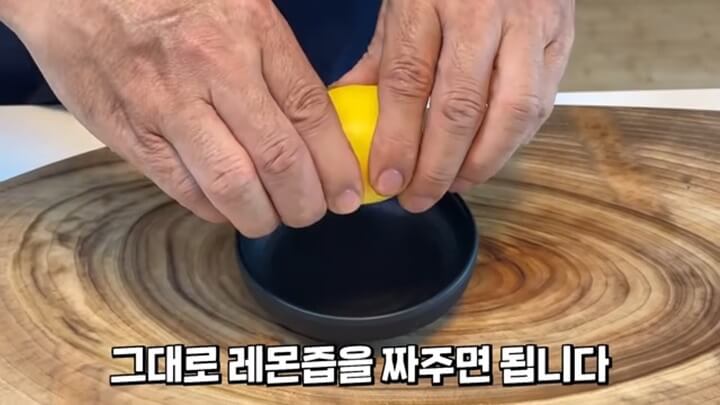 레몬 반 개는 씨를 빼 주고 손으로 눌러 레몬즙을 짜 주세요. 레몬 반 개 짜면 1스푼 반 정도의 레몬 즙이 나와요.