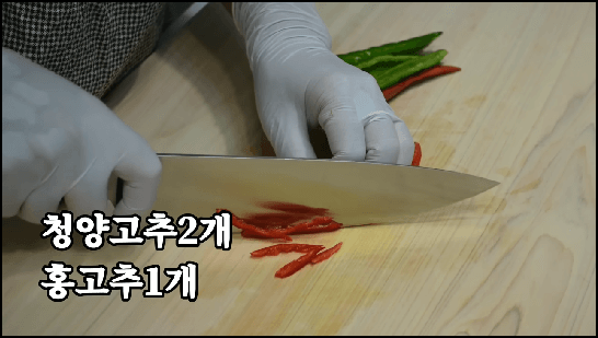 청양고추 2개와 홍고추 1개는 반으로 갈라 씨를 모두 제거한 후 오이채와 비슷하게 채 썰어줍니다. 고추씨를 함께 넣으면 오이냉국에 둥둥 뜨거나 가라앉아서 지저분해 보이기 때문에 깨끗이 제거해 주는 것이 좋습니다.