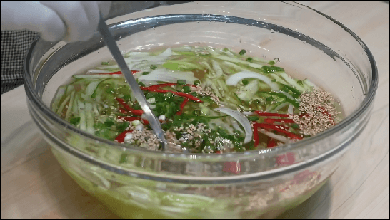 냉국에 오이, 양파, 청양고추, 홍고추, 쪽파 썬 것을 모두 넣고, 통깨도 같이 넣어준 후 잘 섞어주어 채소의 향이 냉국 베이스 국물과 조화롭게 어우러지도록 한 후 맛을 봐서 최종 간을 맞추면 됩니다. 본인의 입맛에 맞게 신맛, 단맛, 짠맛을 맞춰주면 됩니다.