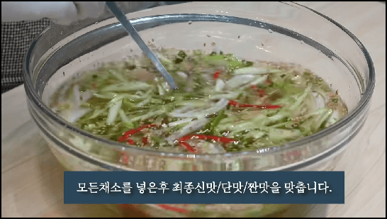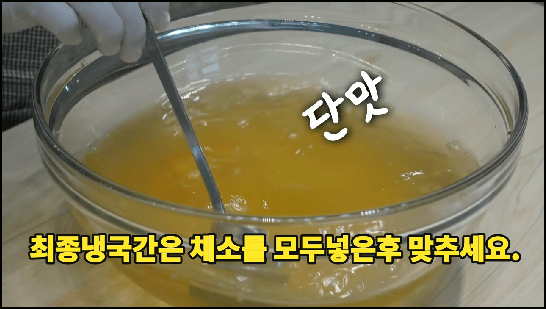 오이냉국은 새콤달콤한 맛이 포인트인데요, 설탕과 식초를 알맞게 넣어 맛을 맞추면 되고, 최종 간은 모든 채소를 다 넣은 후에 맞춰주어야 합니다.