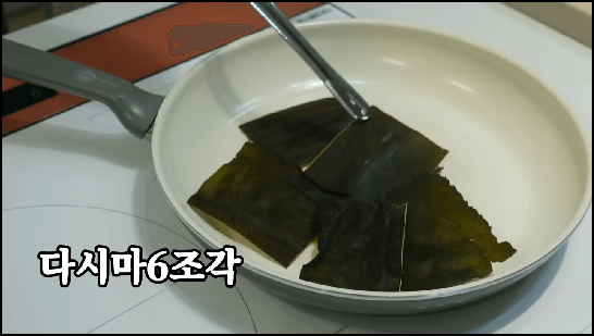 먼저 다시마를 마른 팬에 살짝 노릇노릇하게 구워줍니다. 그리고 찬물에 담가서 1일간 냉장고에 두어 천천히 다시마가 우러날 수 있도록 해 줍니다. 이렇게 하루 정도 우려내면 기가 막힌 맛의 다시마 육수가 제대로 만들어집니다.