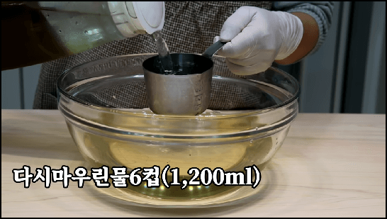 이제 본격적으로 오이냉국을 만들어 봅시다. 먼저 다시마 우린 물 만들었던 것을 냉장고에 꺼내서 6컵을 부어줍니다. 냉장고에 두었기 때문에 시원하게 바로 먹을 수 있습니다.