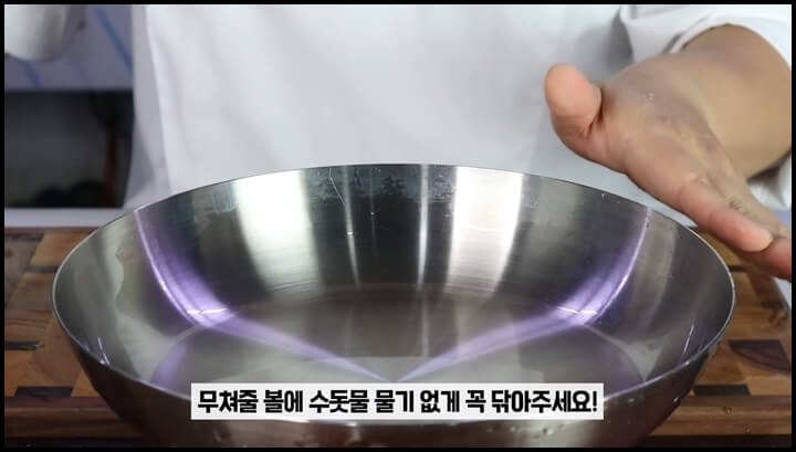 무침용 그릇에 물기없이 마른 상태로 잘 닦아줍니다. 그래야만 냉장고에 보관했을 때 오래 보관이 가능하고 맛있게 먹을 수 있습니다.