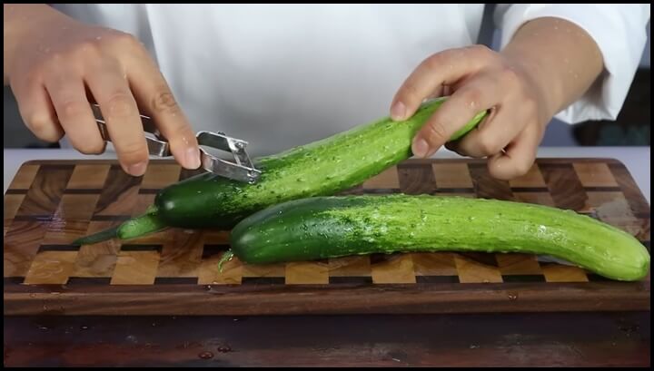 그리고 생으로 오이를 먹었을 때 쓴맛이 나는 경우가 있는데요, 오이의 쓴맛을 제거하는 확실한 방법 두가지! 바로 오이 끝 부분의 진한 초록색 껍질을 필러로 제거해 주는 것입니다. 그리고 또 하나는 꼭지를 잘라주는데요, 꼭지의 2cm 정도를 잘라주는 것입니다. 이렇게 하면 오이의 쓴맛은 확실히 제거되어 더욱 맛있게 먹을 수 있습니다.