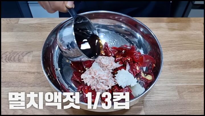 5) 멸치 액젓 1/3컵을 넣고 잘 섞어서 30분만 불려줍니다. 그러면 훨씬 더 잘 갈립니다