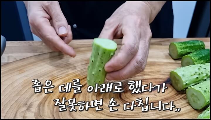 그리고 또 하나의 꿀 팁을 알려드리자면 오이의 단면이 넓은 쪽이 있고 좁은 쪽이 있는데 만약 좁은 쪽을 아래쪽에 놓고 자르면 오이가 넘어질 수 있기 때문에 잘못하면 손을 다칠 수 있습니다. 그러니 오이의 넓은 면을 아래로 놓고 칼집을 내는 것이 훨씬 쉽습니다.