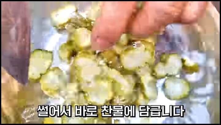 3) 썬 오이는 바로 찬물에 담가줍니다. 이렇게 찬물에 담가서 짠 기를 빼 주어야 합니다. 그렇지 않으면 짜서 먹을 수가 없습니다.