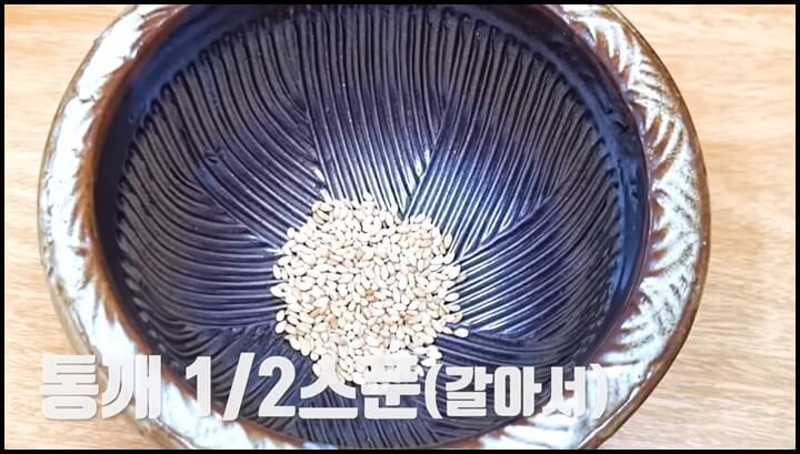 4) 깨는 반은 갈아서 깨소금으로 넣고, 반은 통깨로 그대로 뿌려줍니다.