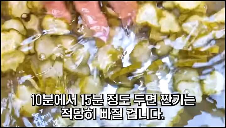 4) 찬물에 10~15분 정도 담가둡니다. 각 가정의 오이지 짠 맛에 따라 찬물에 담가두는 시간을 조절하면 됩니다.