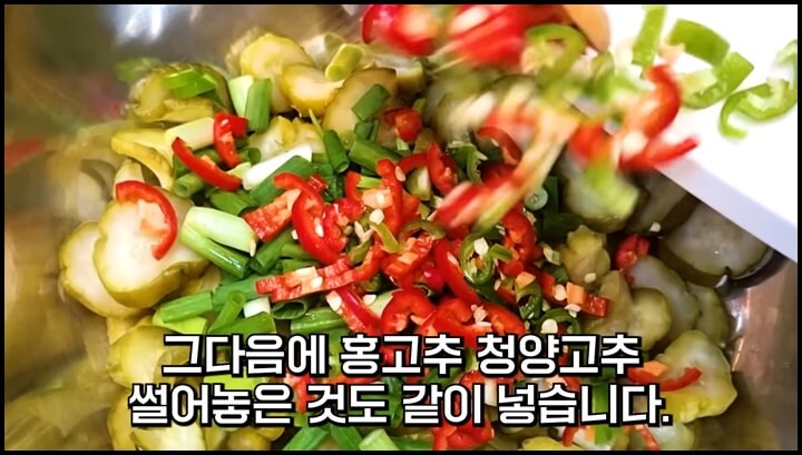 1) 물기 짠 오이지를 넣고, 홍고추, 청양고추 썰어둔 것도 그릇에 모두 담아줍니다.