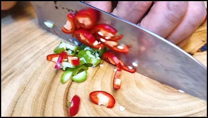 2) 홍고추 1개, 청양고추 1개는 반으로 갈라 송송 썰어줍니다.