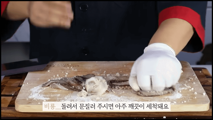 4) 마지막으로 오징어를 딱 잡고 돌려서 문질러주면 아주 깨끗이 세척됩니다.