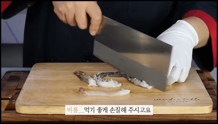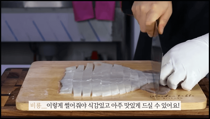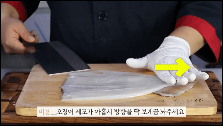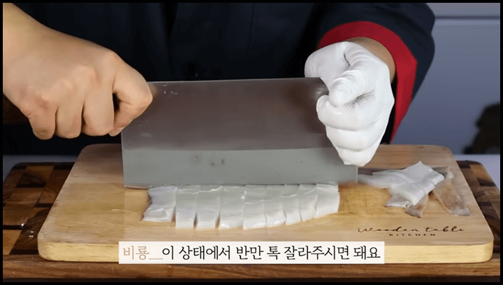2) 몸통은 근육질이 가로로 되어 있기 때문에 오징어 세모가 9시 방향을 보게끔 딱 놓고, 굵게 썰어줍니다. 그리고 반으로 톡 썰어주면 됩니다.
