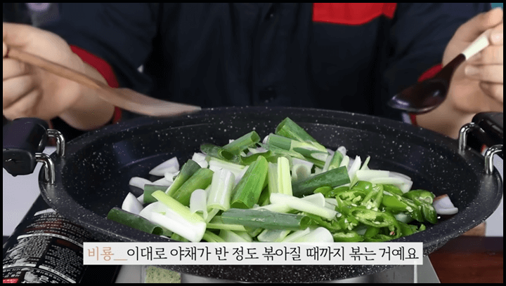 2) 양파와 청양고추, 대파를 모두 넣고 볶아줍니다. 야채가 반 정도 볶아질 때까지 볶아줍니다. 야채가 숨이 죽는 것 괜찮습니다. 오징어가 주인공이니 야채 숨 죽는 것은 개의치 마세요.