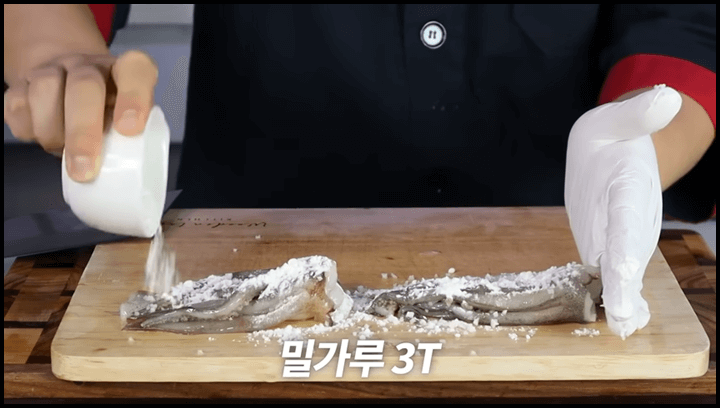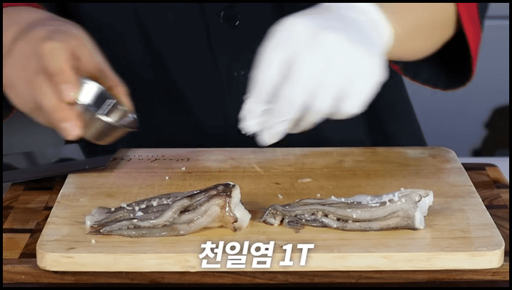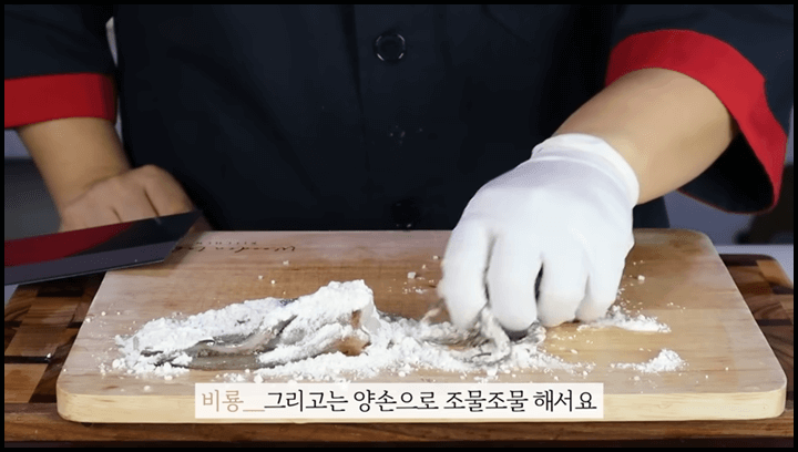 1) 오징어에 천일염 1큰술을 뿌려줍니다.