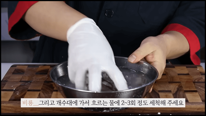 3) 양손으로 조물조물 문질러서 다리 겉면의 이물질을 모두 제거해 줍니다. 이렇게 세척해주면 오징어의 잡내도 날아가고 깨끗하고 신선한 오징어를 먹을 수 있습니다.