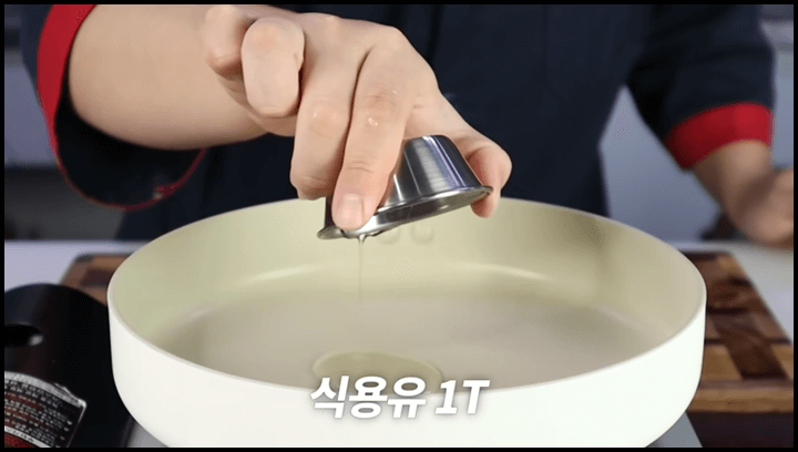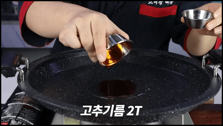1) 팬에 식용유 1큰술, 고추기름 2큰술을 넣어줍니다. 고추기름을 사용하면 칼칼하고 매운맛이 확 올라와서 이렇게 섞어사용합니다.