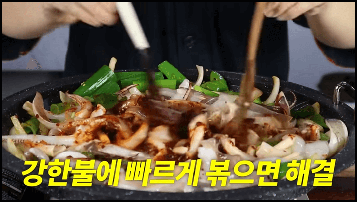 5) 오징어에서 물 많이 나오지 않으려면 강한 불에서 빠르게 볶아내면 됩니다.