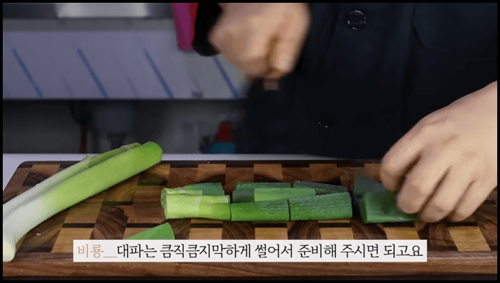 1) 대파는 큼직하게 썰어줍니다. 대파의 흰부분은 반으로 갈라서 같은 길이로 썰어줍니다.