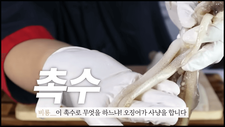 2) 손질된 오징어에서 꼭 제거해 줄 것이 또 하나 있는데요, 그건 바로 촉수입니다. 촉수는 오징어 다리 중 길쭉한 2개를 말하는데요, 오징어는 이 촉수를 이용해서 사냥을 한다고 합니다. 그래서 촉수 끝부분은 이물질이 많고 지저분할 수 있습니다. 따라서 요리할 때 이 촉수를 제거해주면 더 맛있게 먹을 수 있습니다.