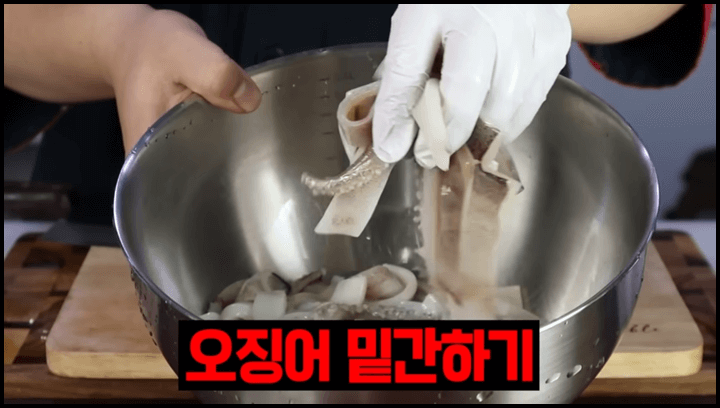오징어에 밑간을 해주면 오징어에 간이 배면서 양념 맛과 더불어 오징어 자체의 맛도 느낄 수 있습니다.