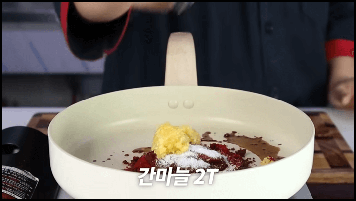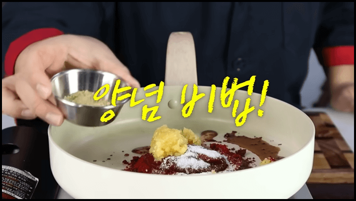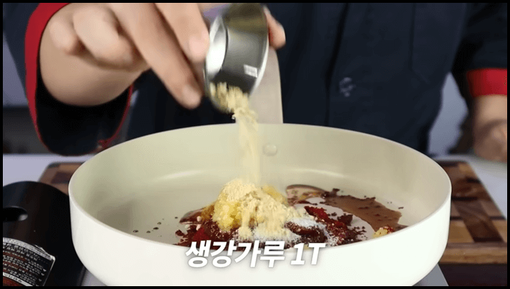 4) 여기에 비법 가루가 들어갑니다. 핵심 양념은 바로 생강가루입니다. 생강가루 1큰술을 넣어주면 맛이 확 살아나고 오징어 잡내까지 한번 더 잡아주기 때문에 더욱 맛있어집니다.