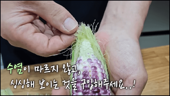옥수수를 고를 때는 수염이 싱싱한 것을 고르세요. 옥수수 수염이 싱싱한 것이 아주 맛있는 옥수수입니다. 그리고 알맹이가 보들보들한 것이 맛있습니다.