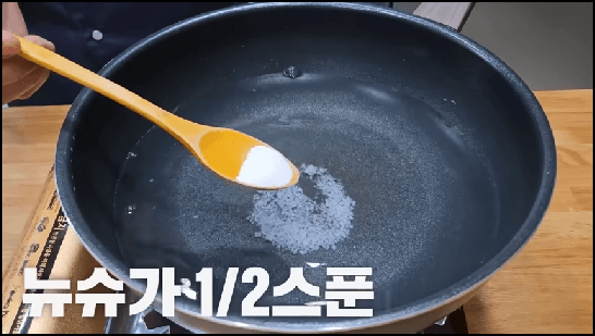 먼저 냄비에 옥수수 삶을 물을 끓입니다. 냄비에 1.2리터 물을 붓고, 소금 깍아서 1스푼, 뉴슈가 1/2스푼을 넣어줍니다. 그리고 건다시마 5g 한조각을 씻어서 넣어줍니다. 숟가락으로 저어서 소금과 뉴슈가를 녹여주고 물을 끓여줍니다.