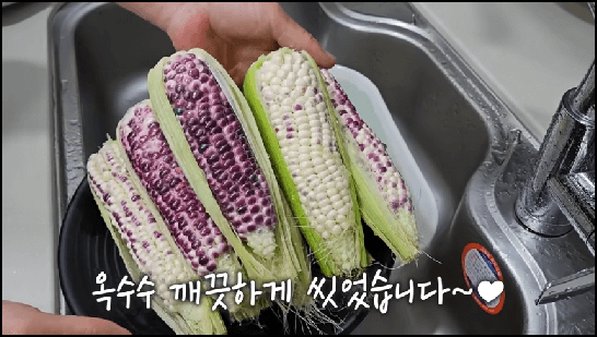 물을 끓이는 동안 옥수수를 씻어줍니다. 옥수수는 껍질을 다 벗기지 말고 속껍질 2겹 정도를 남겨두고, 옥수수 수염도 그대로 두고 삶는 것이 좋습니다. 그래야 옥수수의 단맛을 훨씬 더 느낄 수 있습니다.