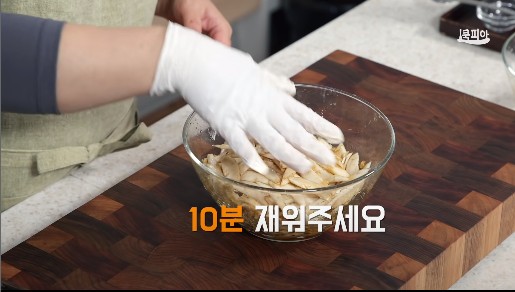 10분 후에 보면 바닥에 물이 생기는데요, 이 물은 버리지 말고 볶을 때 같이 넣고 볶아요. 이 물을 넣고 볶으면 우엉의 참 맛이 더욱 살아나요.
