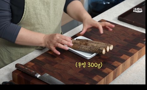 우엉은 20cm 정도의 길이로 잘라서 준비해요. 이 정도 길이의 우엉 5개면 총무게가 300g 정도 된답니다.