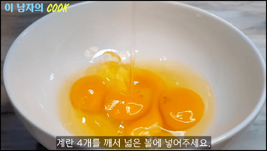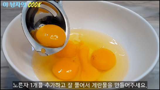 계란 4개에 노른자 1개를 더 추가해서 잘 풀어줍니다. 노란색을 더 잘 내기 위해 노른자 1개를 더 추가합니다.