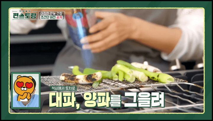 4) 대파, 양파를 타듯이 굽고, 토치에 그을려준 후 간장물에 넣고 끓입니다.