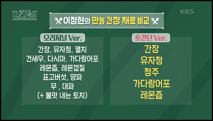 오리지널 만능간장보다 재료도 확 줄었고, 과정도 엄청 간소해져서 누구나 쉽게 따라할 수 있게 되었습니다. 만드는 시간도 15분 정도로 확 줄었기 때문에 간편하게 만들 수 있으니 이정현 만능간장, 그동안 엄두를 못내셨던 분들은 지금이라도 초간단 버전으로 시도해보실 수 있습니다.