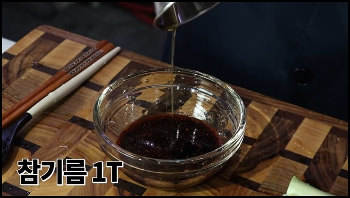 2) 설탕 1큰술, 참기름 1큰술을 넣어줍니다.