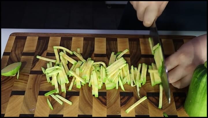 2) 애호박도 당근 길이와 비슷하게 채 썰어줍니다.