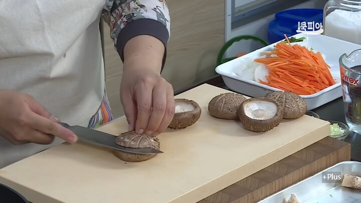 양파와 당근은 얇게 채 썰어줍니다. 표고버섯은 기둥을 잘라주는데, 잘라낸 버섯기둥은 버리지 말고 따로 모아두었다가 육수 낼 때 사용하거나 아니면 버섯기둥만 모아서 장조림처럼 만들어 먹어도 좋습니다.