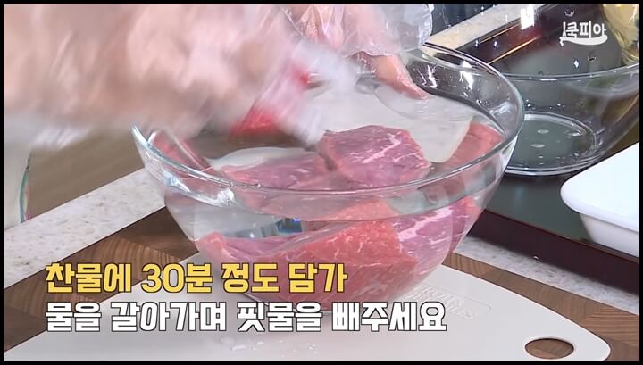 소고기는 덩어리를 4등분 정도로 잘라서 찬물에 담가 30분 정도 핏물을 빼 줍니다. 중간에 핏물 밴 것을 버리고 다시 한번 새 물을 채워서 핏물을 빼야 깨끗하게 핏물을 뺄 수 있습니다.