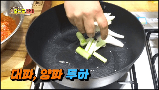 먼저 팬에 기름을 두르고 대파와 양파를 넣어 살짝 볶아줍니다. 기름에 파와 양파의 향이 나도록 해 주는 과정입니다.