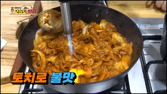 다 익었다면 불을 줄이고, 불맛을 내 주기 위해 토치로 살짝 그을려 주면 됩니다. 토치가 없다면 생략해도 좋습니다.