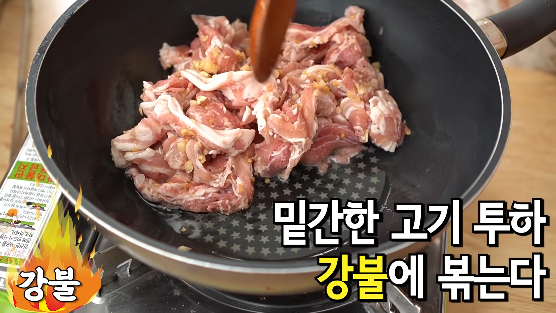그래서 기름 두른 강불에 바짝 고기만 먼저 구워주어야 합니다. 이렇게 고기를 충분히 구운 다음에 양념과 야채를 넣어주면 고기 자체가 맛있는 맛을 품고 있어서 더욱 맛있는 제육볶음을 만들 수 있습니다.