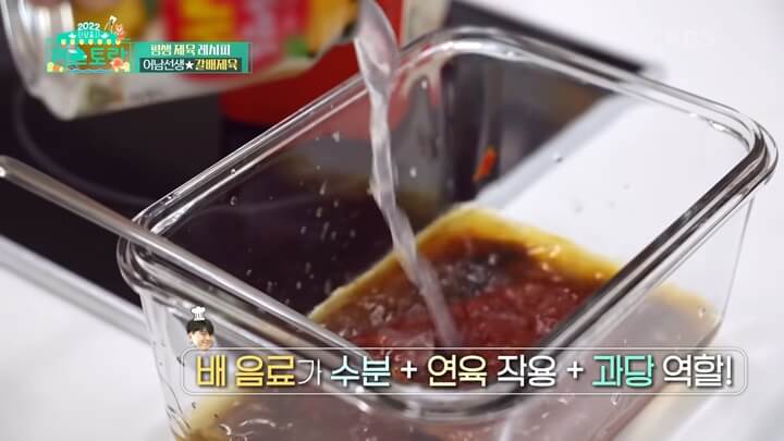 이런 경우를 위해 배 대신 갈아만든 배 음료를 활용해요. 배 음료를 넣어주면 수분도 있고, 연육 작용과 과당의 역할을 해주어서 아주 안성맞춤이에요. 배 음료 작은 것 1캔 238ml짜리를 넣어주면 됩니다.